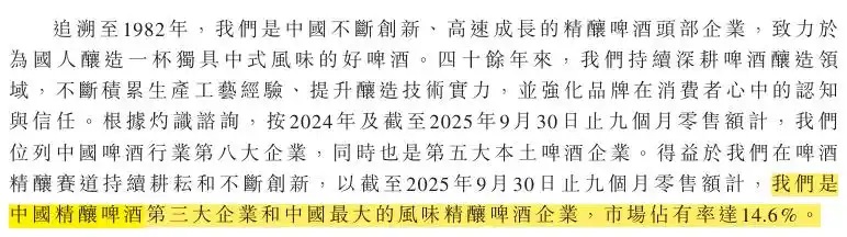 在细分赛道,金星是领跑者。 据灼识咨询数据,以2025年前三季度零售额计,金星是中国精酿啤酒第三大企业和最大的风味精酿啤酒企业,市场占有率达14.6%。