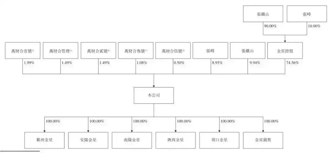 金星啤酒为张氏父子100%绝对控股,股权高度集中、治理结构高度家族化。招股书明确,截至最后实际可行日期,张铁山、张峰父子及关联主体合计持有公司100%权益:金星控股(张铁山90%、张峰10%)持股74.56%;张铁山直接持股9.94%;张峰直接持股8.95%;张峰通过万财合壹号、万财合管理、万财合贰号、万财合叁号、万财合伍号五家员工持股平台,合计控制6.55%权益。