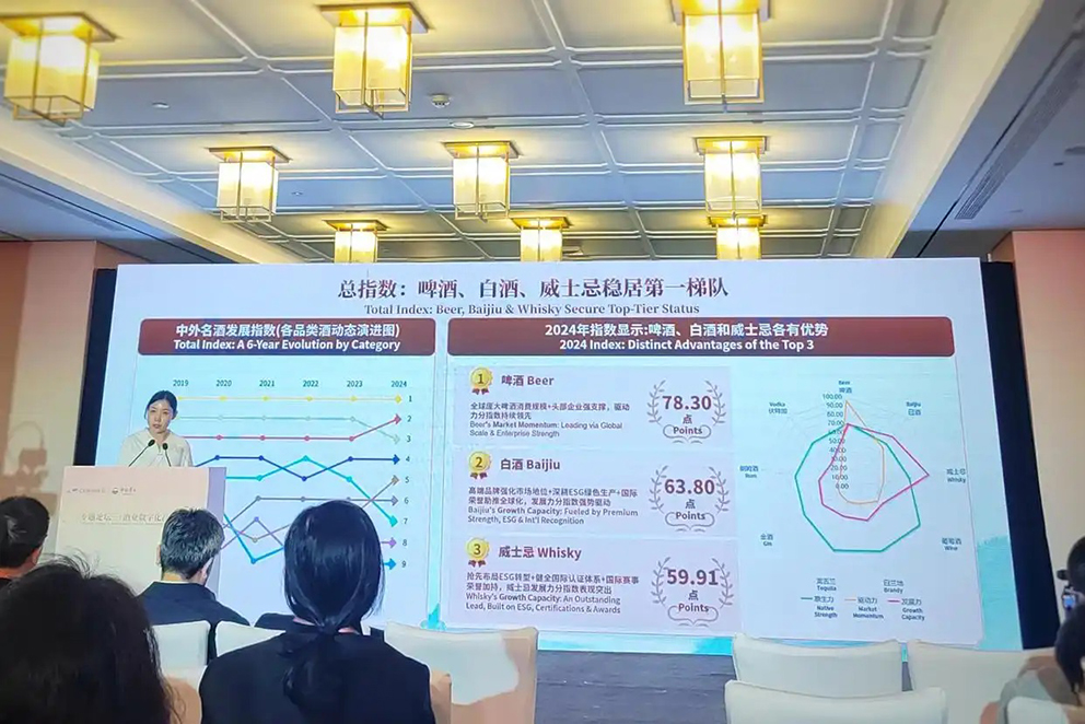 10月28日,在贵州仁怀举行的2025赤水河论坛上,新华指数研究院副院长亓芳芳发布了《中外名酒发展指数报告(2025)》。指数显示,2019—2024年间,啤酒、白酒、威士忌稳居九大品类酒前三,共同构成全球名酒第一梯队。