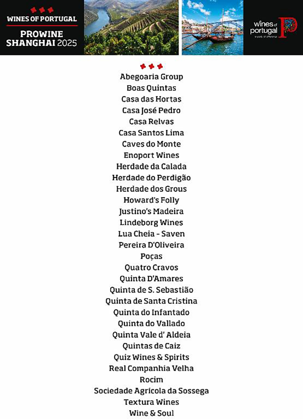 参展商名单(按首字母顺序排列) 葡萄牙葡萄酒协会主席梵尔高(Frederico Falcão)表示:“自葡萄牙葡萄酒于2010年战略性进入中国大陆市场以来,我们观察到消费者偏好的积极转变。凭借250多种本土葡萄品种、多样化的风土条件,以及兼具传统与创新的酿造工艺,葡萄牙葡萄酒展现出卓越的独特性。令人欣喜的是,越来越多的中国消费者开始认可我们所提供的独特价值——近年来葡萄牙葡萄酒对华出口的均价持续攀升就是力证。”