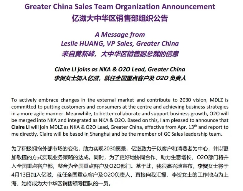 亿滋大中华区今年3月由新零售发展部一分为二拆分出来的全国重点客户部,终于迎来掌舵人!至此,曾步宇不用再暂时代管该职位了。