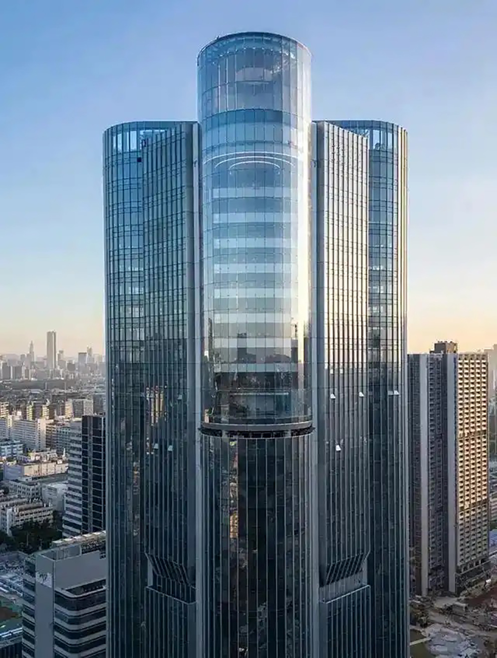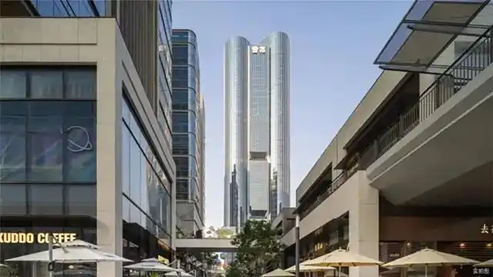 建筑群从中提取筒仓意象,错落的天际线间,高达188米的雪花啤酒总部大厦尤为醒目,形体呼应啤酒罐体特征,通过三个体块组合而成,将大弧度曲线与平直线条巧妙融合。