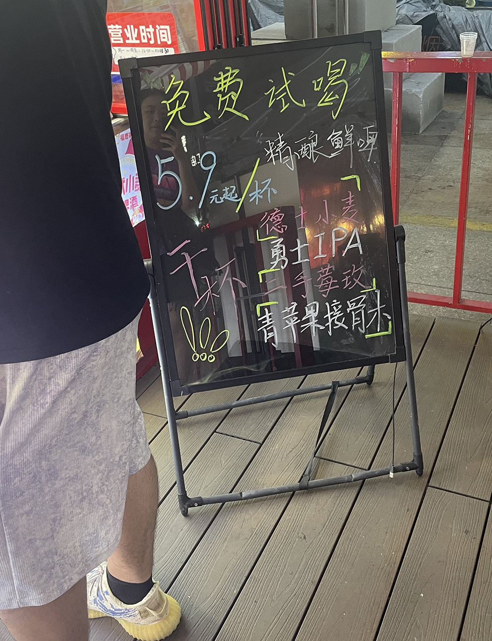 店员表示,客流主要来自周边用餐的中年男性和年轻群体。界面记者在店期间,有附近烧烤店顾客一次性来福鹿家购买6斤鲜啤;也有结伴聚会的年轻人来探店,女生更喜欢尝试果啤等甜味精酿,男性则较多选择福鹿鲜啤、德式小麦等传统口味。